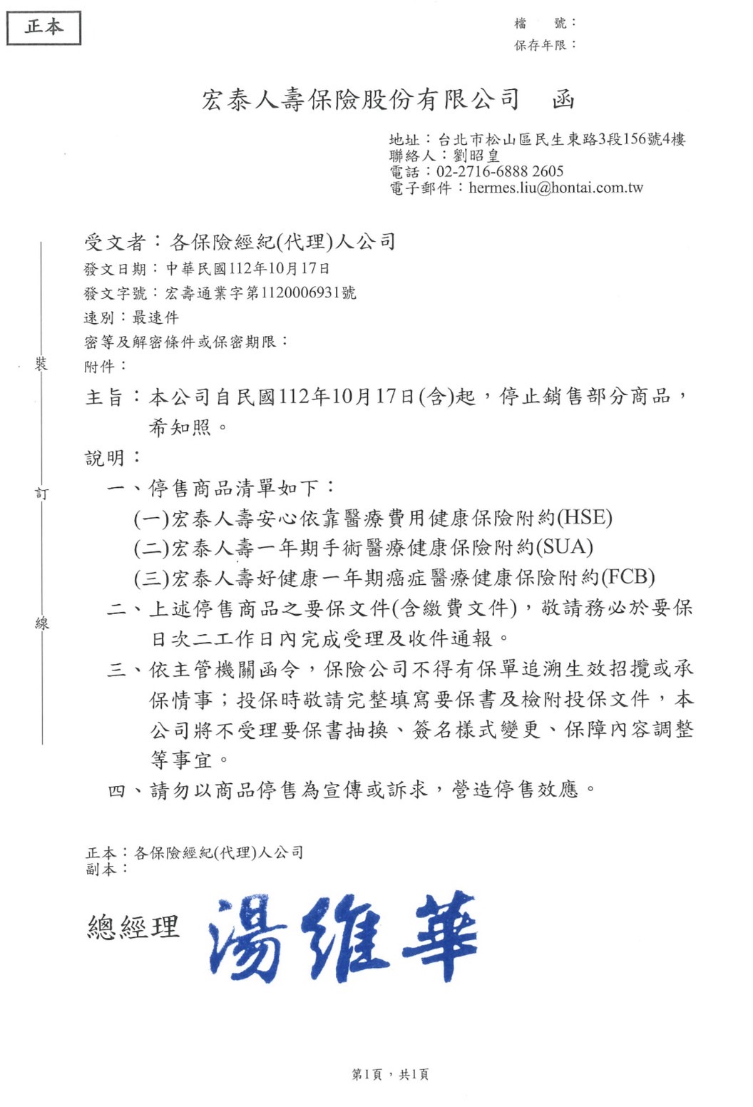 宏泰人壽~112/10/17起,安心醫靠等3張商品停售通知~