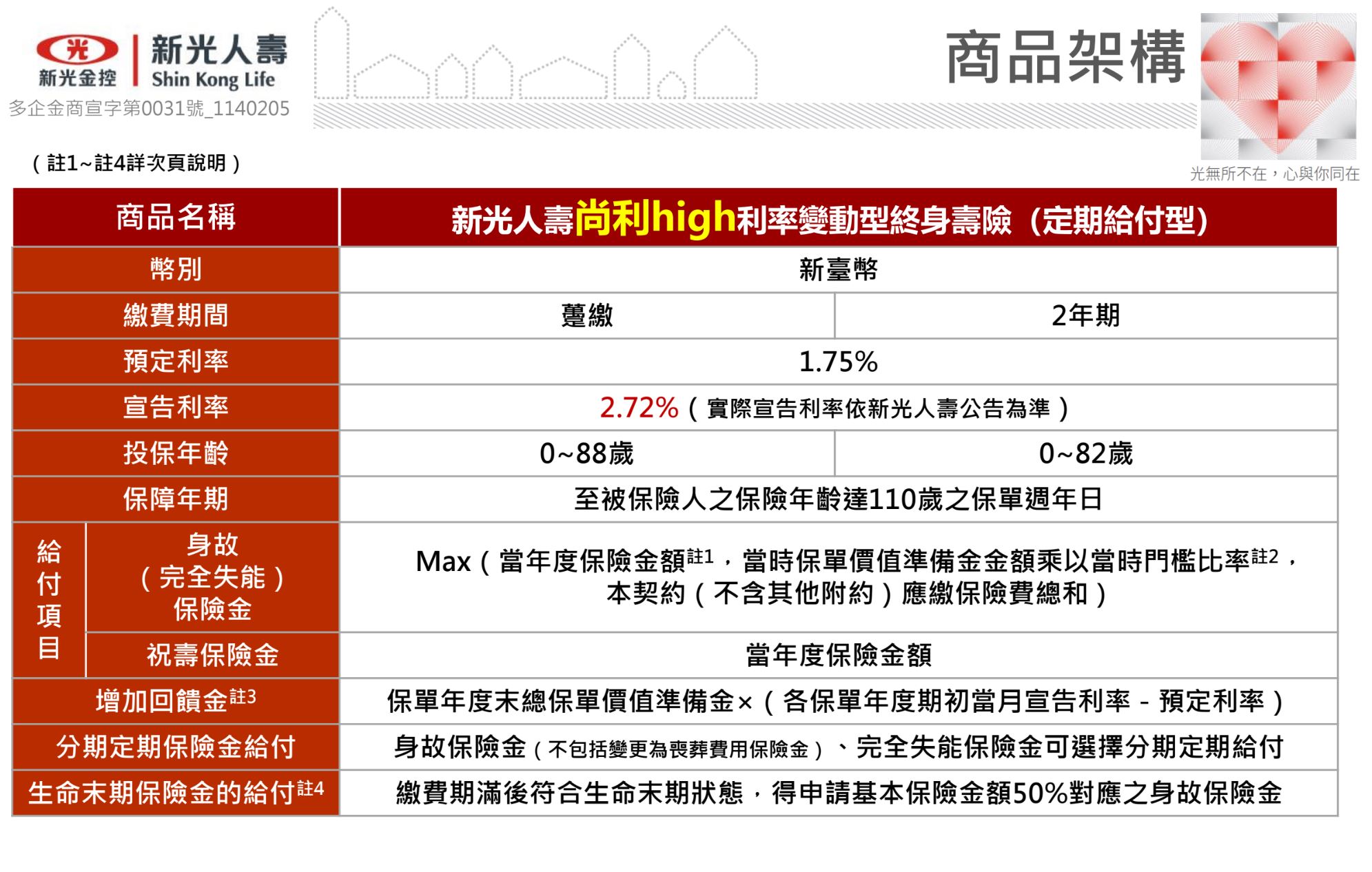 新光人壽尚利high利率變動型終身壽險(定期給付型) 幣別 新臺幣 繳費期間 躉繳 2年期 預定利率 1.75% 宣告利率 2.72%(實際宣告利率依新光人壽公告為準) 投保年齡: 躉繳:0~88歲 2年期:0~82歲