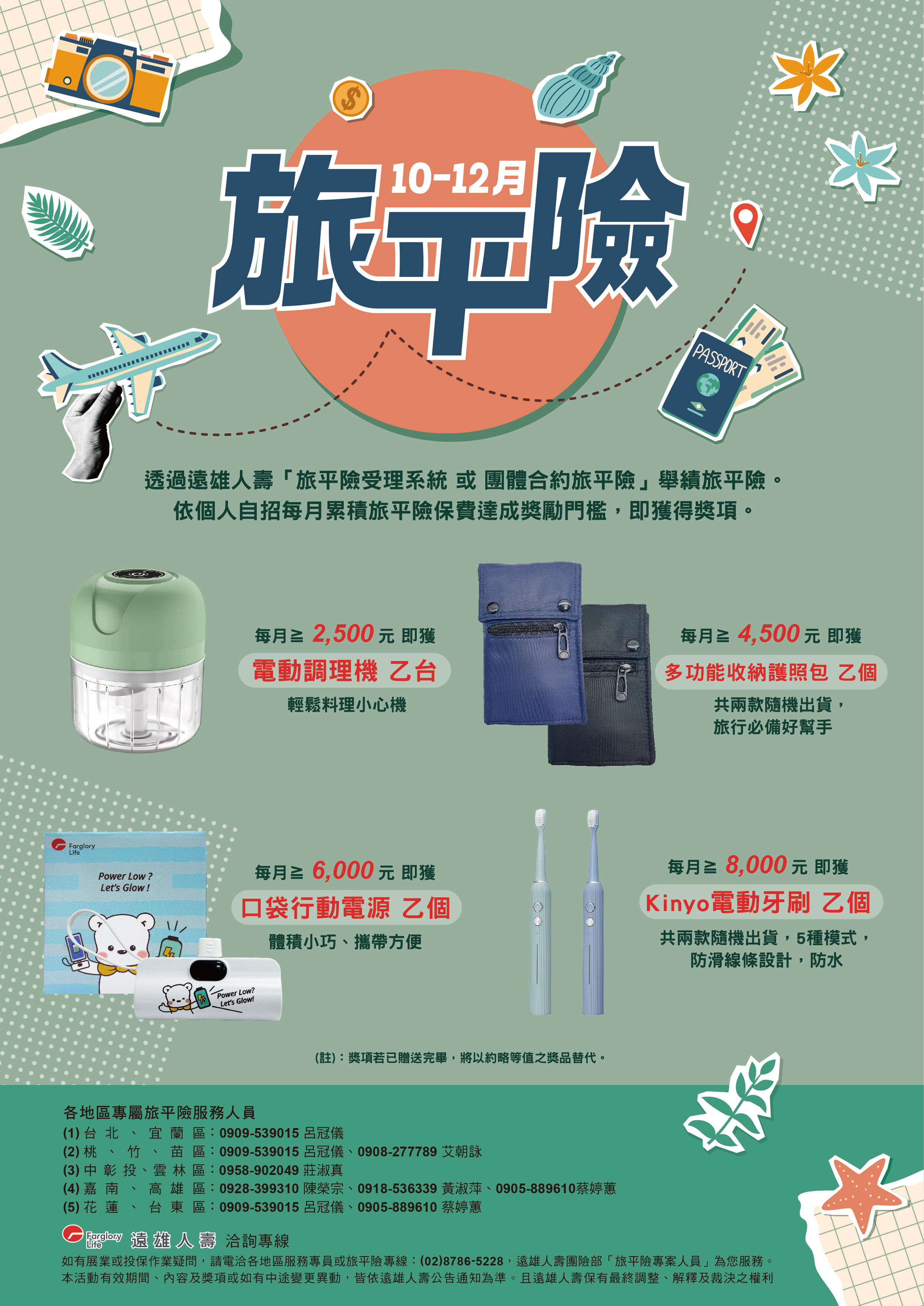 附件檔案提供:遠雄人壽2025年旅平險獎勵活動通知 1. 10~12月專屬獎勵活動通知 2. Q4受理系統滿額禮EDM 附件: 經代通路-10-12月「旅平險」獎勵-EDM