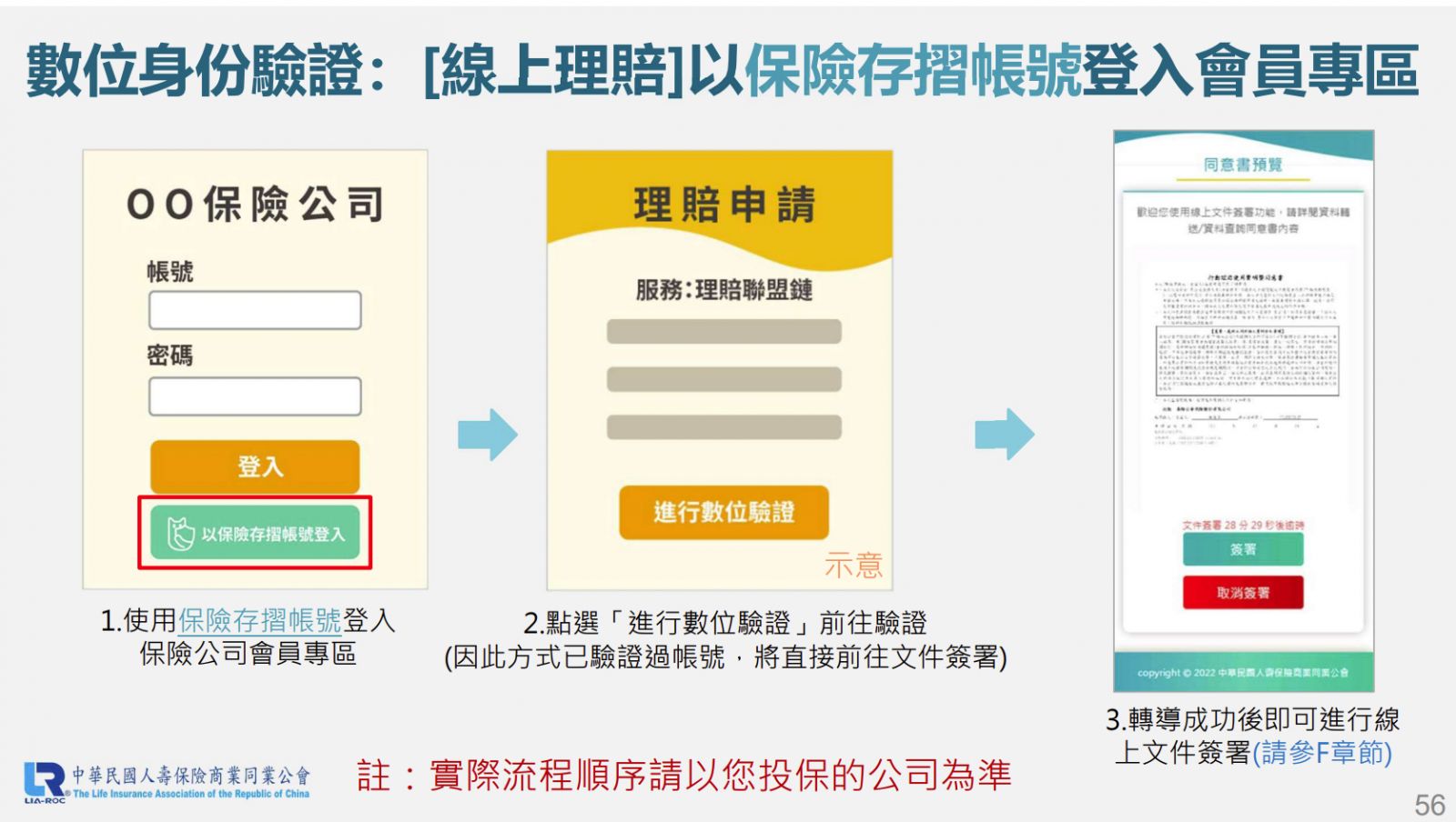 陳乙棋表示,在技術架構上,以前者而言,由於「保險存摺」本身已經具備FIDO與電子簽章技術,因此登入成功後即可進行線上文件簽署完成申請。