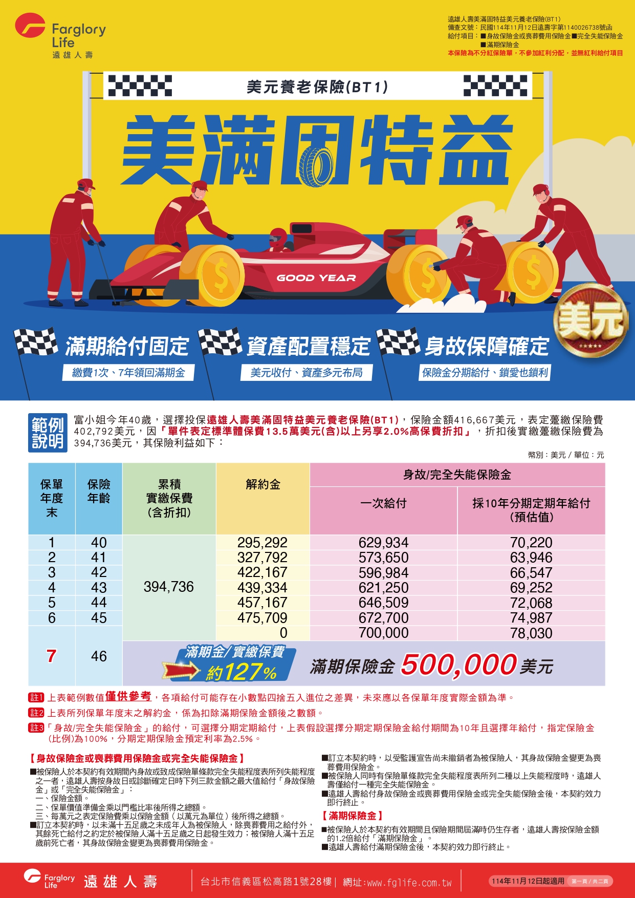 遠雄人壽~美滿固特益美元養老保險_114.11.12起