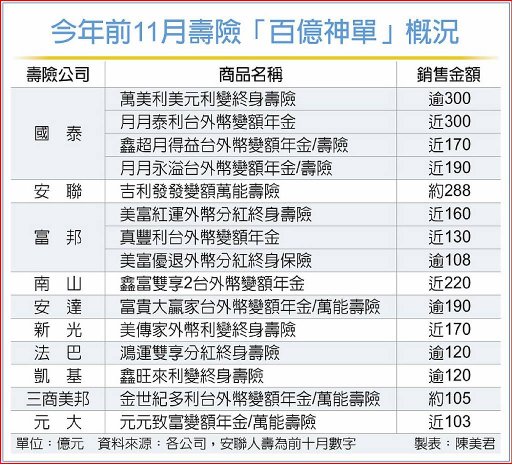 壽險龍頭國泰人壽,今年前11月共有四張百億神單,分別是「萬美利美元利變終身壽險」、「月月泰利台外幣變額年金」、「鑫超月得益台外幣變額年金/壽險」、「月月永溢台外幣變額年金/壽險」,合計銷售金額逾960億元;富邦人壽擁有三張百億神單,分別是「美富紅運外幣分紅終身壽險」、「真豐利台外幣變額年金」及「美富優退外幣分紅終身保險」,合計銷售近400億元;南山人壽「鑫富雙享2台外幣變額年金」,前11月銷售金額逼近220億元;新光人壽「美傳家外幣利變終身壽險」銷售金額近170億元;凱基人壽「鑫旺來利變終身壽險」,今年以來熱賣超過120億元。