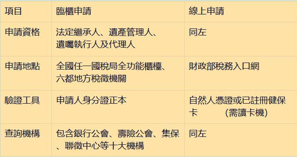 【金融遺產查詢方式對照表】