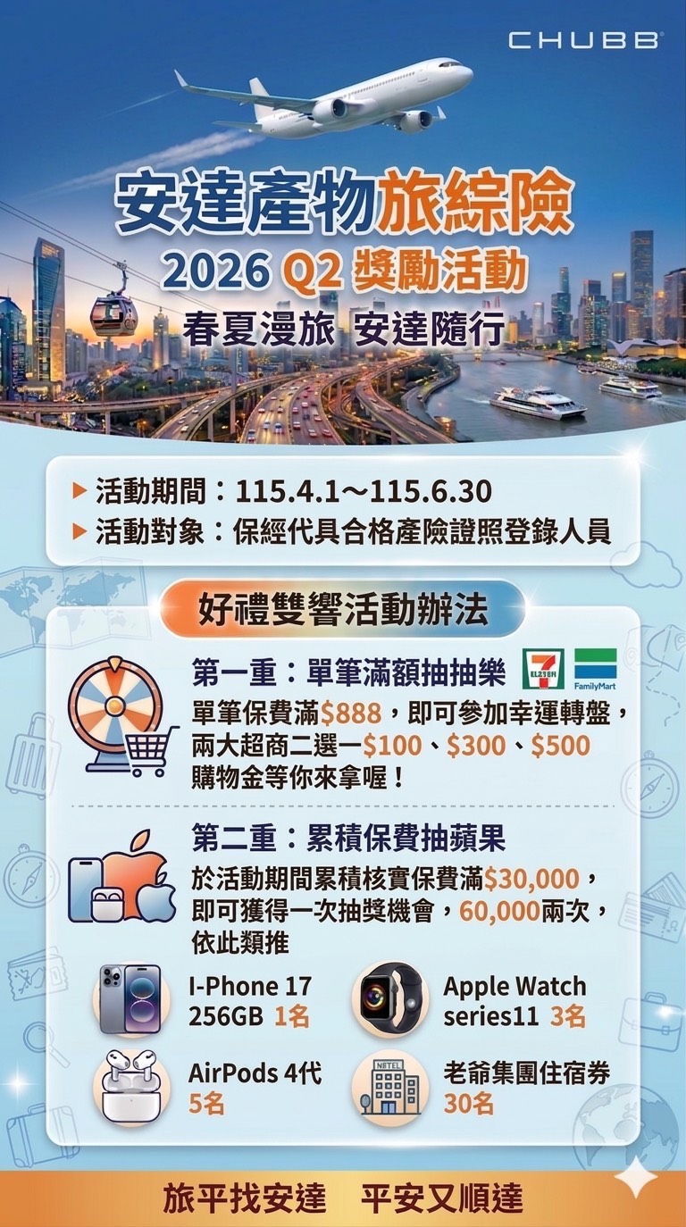 【美商安達產物】~自115年04月01日起辦 『2026Q2 安達旅平 春夏漫旅,安達隨行 』 獎勵活動
