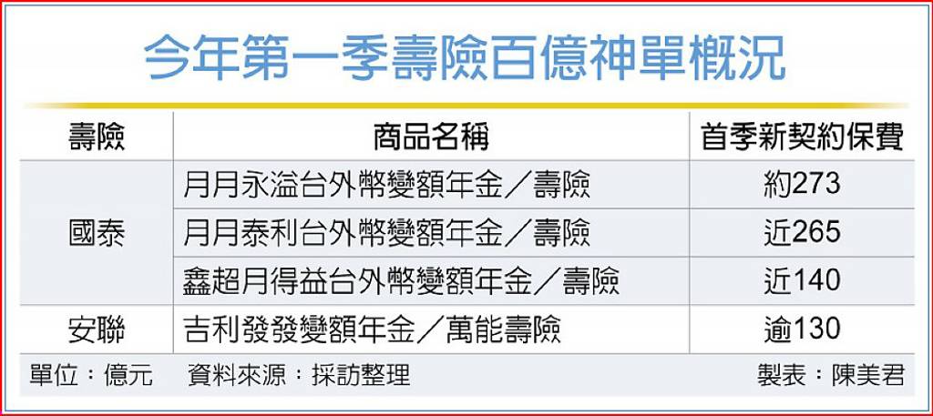 國泰人壽今年首季熱銷的3張神單,分別是「月月永溢」台外幣變額年金/壽險、「月月泰利」台外幣變額年金/壽險,以及「鑫超月得益」台外幣變額年金/壽險,3張合計,貢獻近680億元的新契約保費收入。